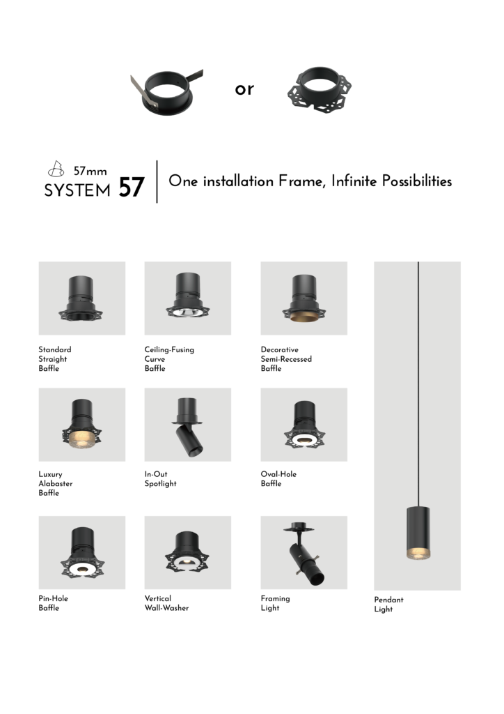 Our unique plug‑and‑play platform means you need only one universal installation frame—such as our popular System 57—to unlock a world of lighting possibilities.