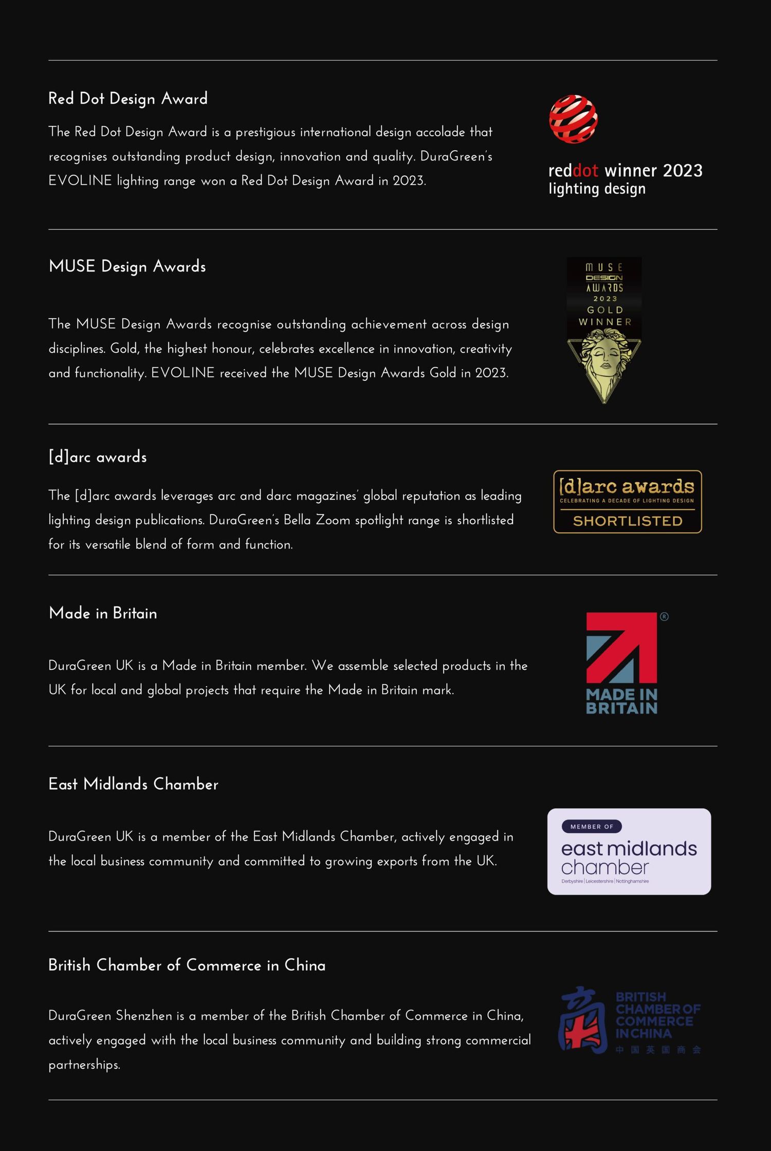 DuraGreen is an award‑winning architectural lighting brand, trusted worldwide for premium architectural lighting—giving specifiers and clients confidence in both aesthetics and long‑term performance.